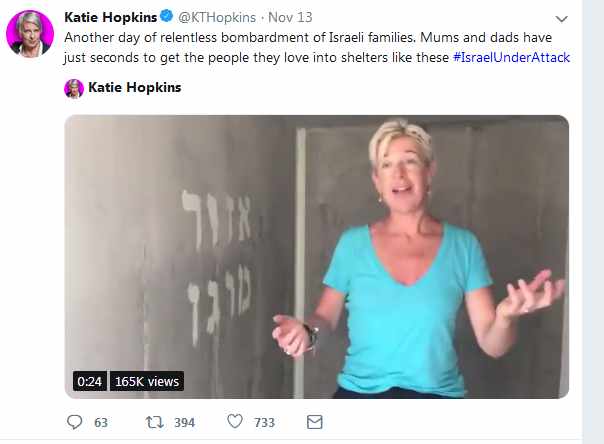 | Katy Hopkins concern for Israeli families contrasts with her disinterest in the victims of the aerial bombing of Gaza's infrastructure |